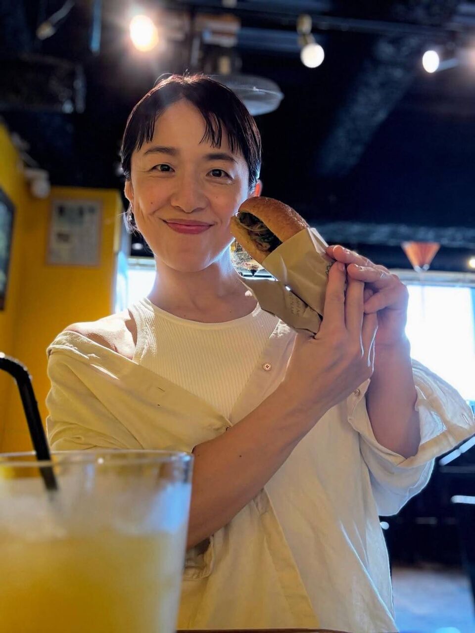 「大好物のバインミー食べに行きました」とインスタグラムで綴り、バインミーを両手で持ち微笑む最新ショットを公開。髪をひとつにまとめシャープな輪郭が際立っている。