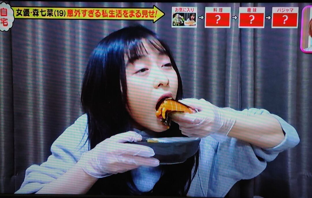 【ご褒美】ごま油と生卵と調味料を浸した生サーモンを海苔で挟んで柵ごとかぶり付く森七菜ちゃん