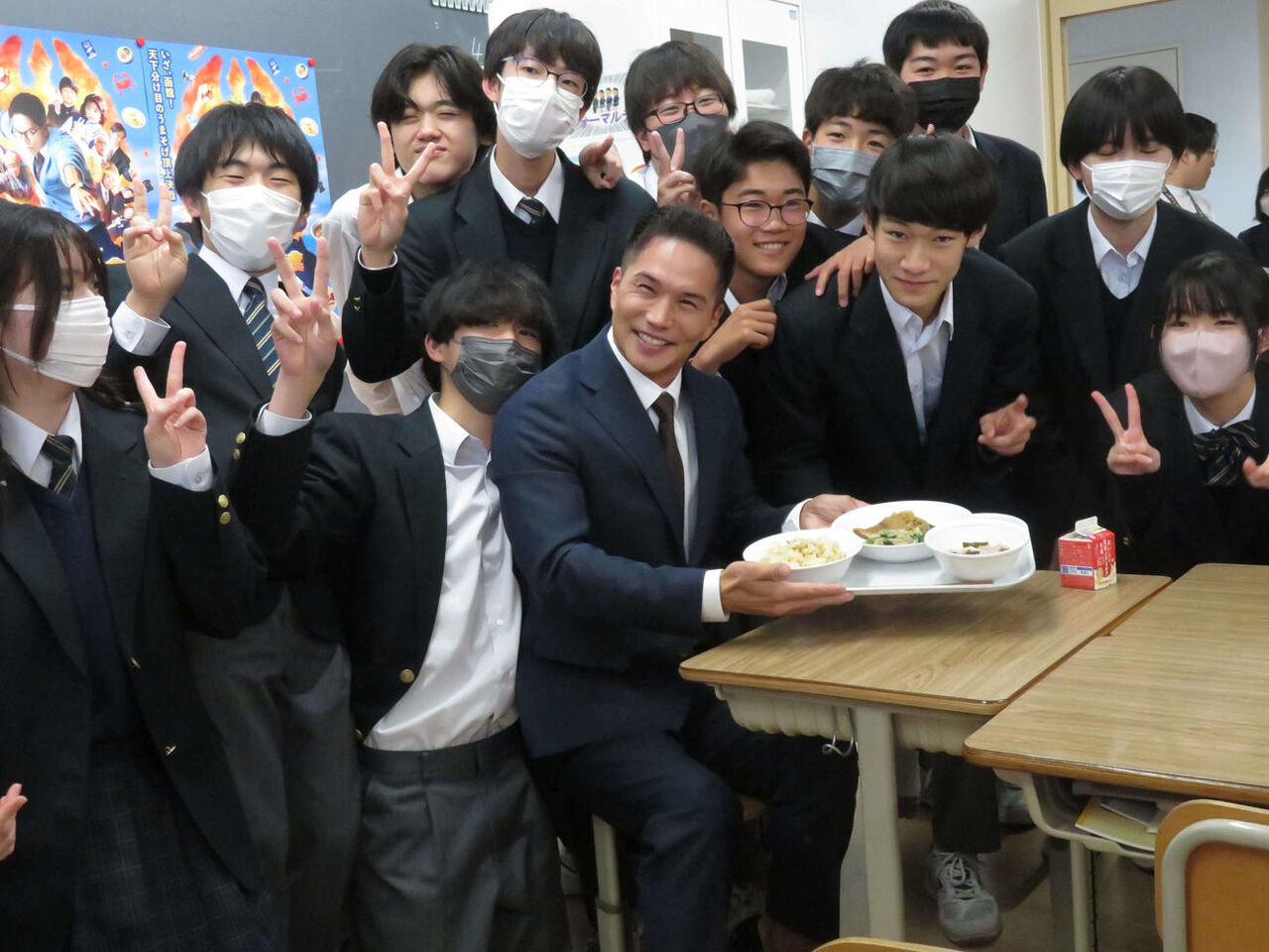 映画「おいしい給食 Road to イカメシ」のイベントで、中学校の給食の時間にサプライズ登場した市原隼人