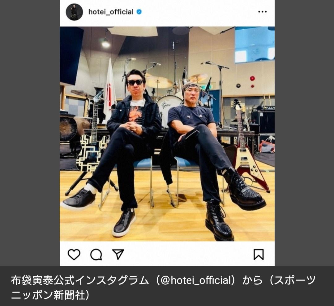 添えられた写真は、ギターやドラムセットなどをバックに、サングラス姿の布袋と、吉川が横並びに座り、足を組んだもの。2人の足の長さが強調されるようなショットだった。