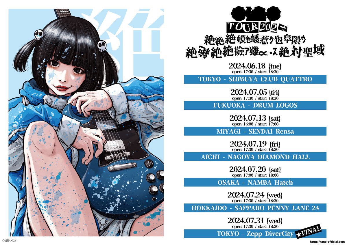 6月18日の東京・渋谷CLUB QUATTROから7月31日の東京・Zepp DiverCity(TOKYO)まで全国7カ所のライブハウスでワンマンライブを行うano。浅野が原作を手がけるアニメーション映画「デッドデッドデーモンズデデデデデストラクション」に声優出演していることから、彼が描き下ろしたanoのイラストがキービジュアルとなった。