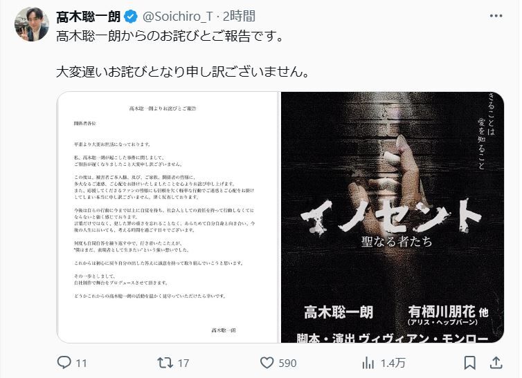 少女にみだらな行為をしたとして昨年11月に逮捕された、俳優高木聡一朗(38)が1日、X(旧ツイッター)を更新。事件について謝罪した。