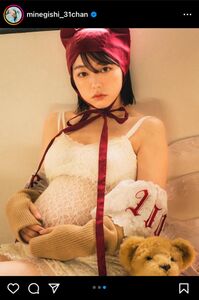 インスタグラムに、白いレース生地のミニワンピを着用してハイソックスとバレリーナシューズを履き、赤い猫耳のような被り物をつけてぬいぐるみとともに撮ったマタニティーフォトをアップした峯岸。「今しかない姿を最高のチームで写真に残してもらいました。」と報告し、「最初の頃、身体の変化に戸惑って少しだけ気持ちが下がってしまっていた私に『神秘的で可愛(かわい)い姿残そうよ〜!』と声をかけてくださったMARCOさん。ウェディングフォトに続き、思い出に残る写真をありがとうございます」と、今回のマタニティーフォトを撮った経緯を明かした。続けて、「ヘアメイクもスタイリングも、自分がイメージしていたマタニティーフォトとは一味違う世界観での撮影に心が躍りました。」と撮影した感想を述べ、最後に「別のカットもすごく素敵(すてき)なのでしばしお付き合いいただけると幸いです。」とつづり、投稿を締めた。