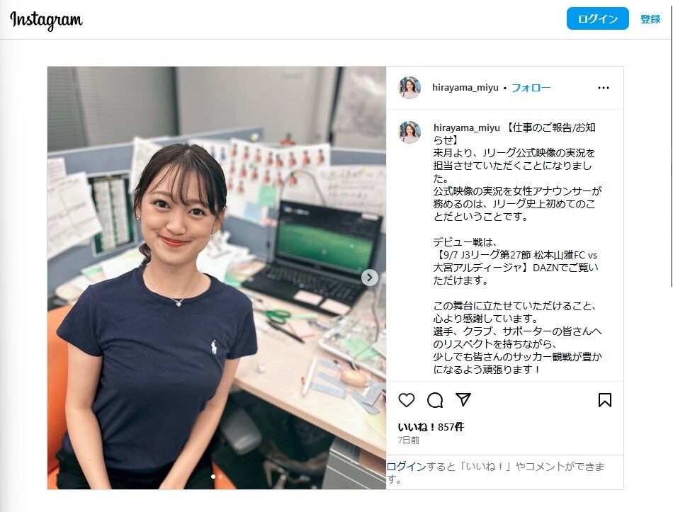先月27日には自身のインスタグラム(@hirayama_miyu)で「来月より、Jリーグ公式映像の実況を担当させていただくことになりました。DAZNで配信される、Jリーグ公式映像の実況を女性アナウンサーが務めるのは、史上初めてのことだということです」と報告し、「この舞台に立たせていただけること、心より感謝しています。選手、クラブ、サポーターの皆さんへのリスペクトを持ちながら、少しでも皆さんのサッカー観戦が豊かになるよう頑張ります!」と決意を表明していた。