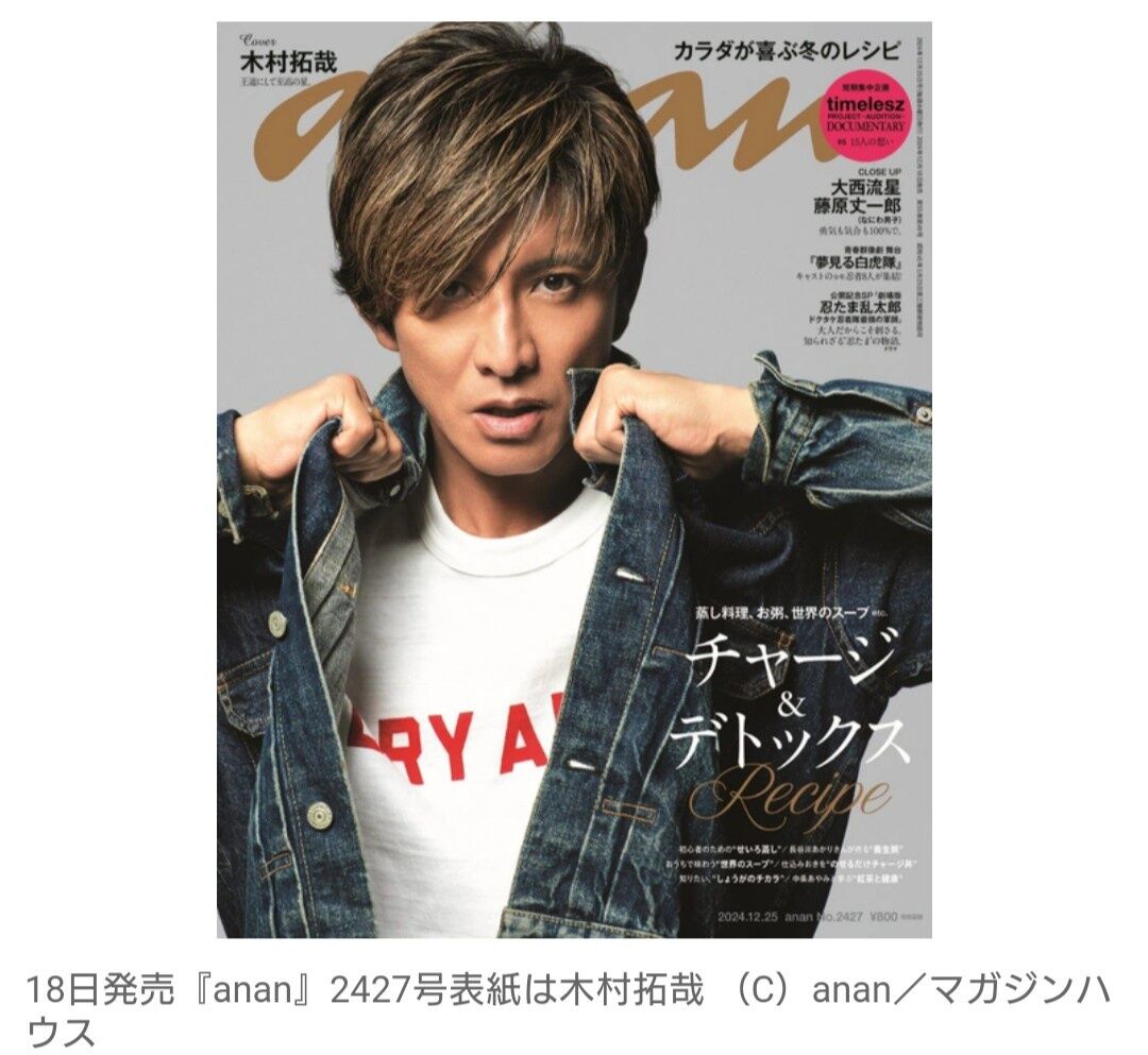 “これぞ木村拓哉!”『anan』表紙で王道Gジャン&ジーンズ 『グランメゾン』尾花夏樹オマージュも