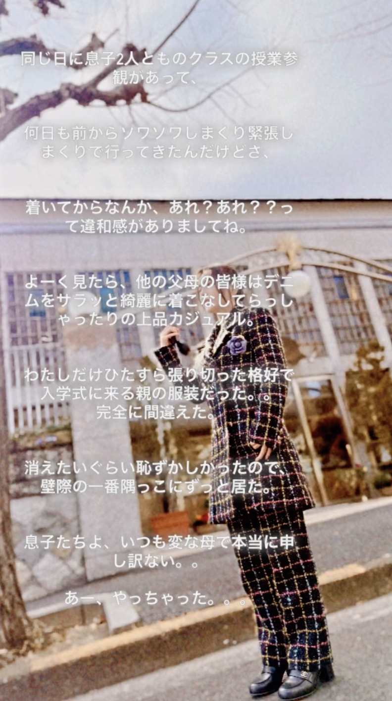「何日も前からソワソワしまくり緊張しまくりで行ってきた」という参観日には、黒地にチェックのロングジャケットのスーツに胸元はカメリア、髪はアップというおしゃれな姿で出席した。